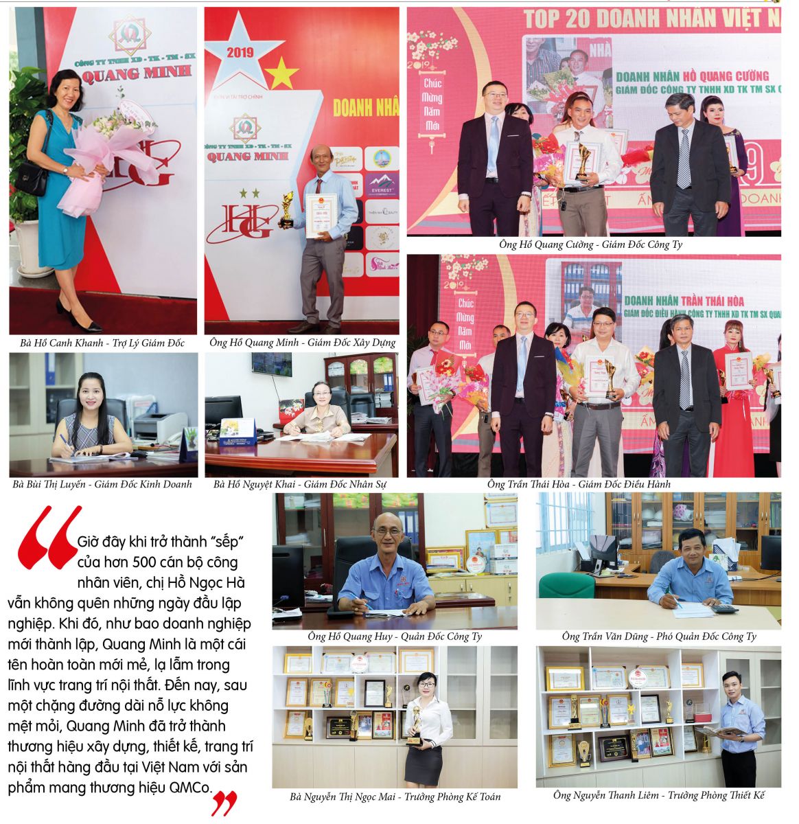 Giờ đây khi trở thành “sếp” của hơn 500 cán bộ công nhân viên, chị Hồ Ngọc Hà vẫn không quên những ngày đầu lập nghiệp. Khi đó, như bao doanh nghiệp mới thành lập, Quang Minh là một cái tên hoàn toàn mới mẻ, lạ lẫm trong lĩnh vực trang trí nội thất. Đến nay, sau một chặng đường dài nỗ lực không mệt mỏi, Quang Minh đã trở thành thương hiệu xây dựng, thiết kế, trang trí nội thất hàng đầu tại Việt Nam với sản phẩm mang thương hiệu QMCo.