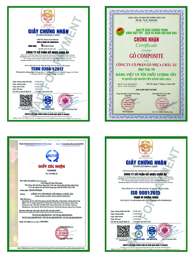 Việc đảm bảo chất lượng từ khâu chọn nguyên liệu cho đến quy trình sản xuất, Công ty Cổ phần Gỗ nhựa Châu Âu – KINGWOOD tự hào tiếp tục khẳng định chất lượng ưu việt của sản phẩm phôi cửa gỗ composite với một loạt các chứng nhận TCVN 9366-1:2012 và ISO 9001:2015. Với tiêu chuẩn này, KINGWOOD đã nâng cao uy tín với khách hàng, đối tác về hệ thống nhà máy và thành phẩm được thừa nhận theo tiêu chuẩn quốc tế.