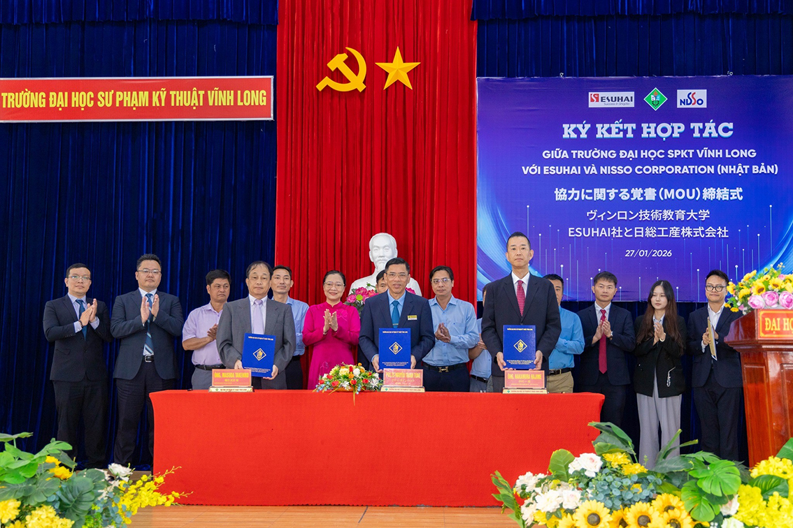 Bên cạnh đầu tư nội lực, Trường Đại học Sư phạm Kỹ thuật Vĩnh Long luôn chủ động mở rộng hợp tác quốc tế và kết nối doanh nghiệp theo phương thức “3 Nhà”. Nhà trường đã ký kết và triển khai hiệu quả nhiều biên bản ghi nhớ với các cơ sở giáo dục tiên tiến, các tổ chức, doanh nghiệp uy tín trong và ngoài nước. Mạng lưới hợp tác này không chỉ tạo điều kiện trao đổi học thuật, chuyển giao công nghệ mà còn mở rộng cơ hội thực tập, việc làm cho sinh viên sau khi tốt nghiệp.